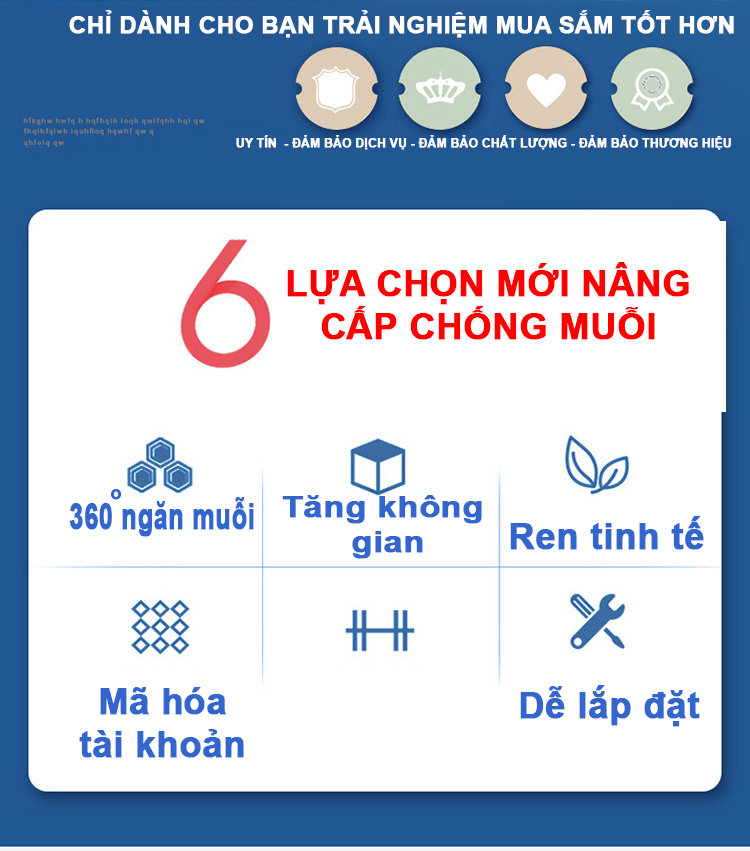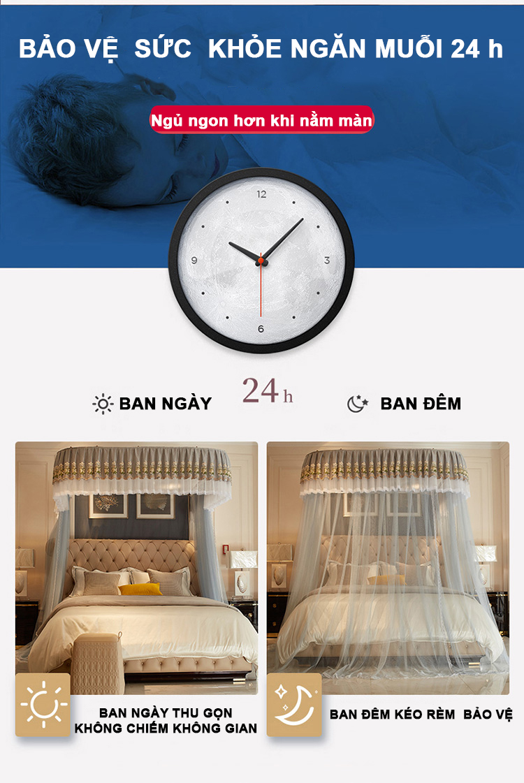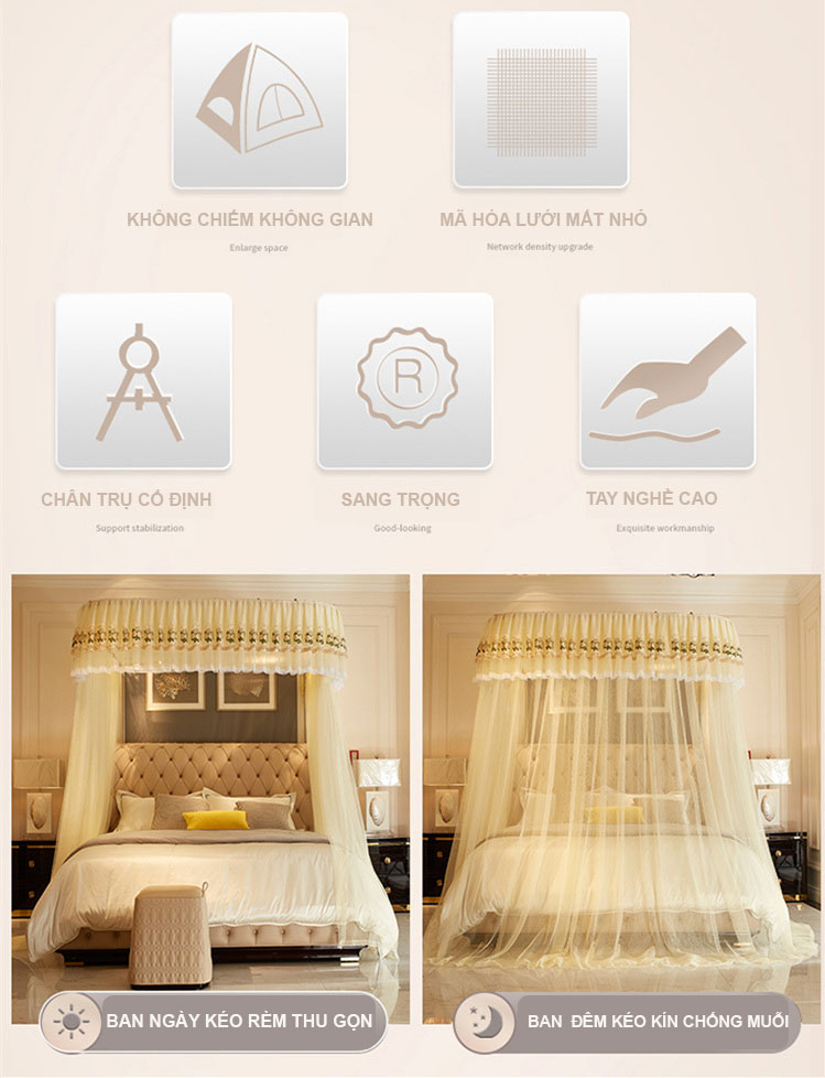 | 🌟 Tính năng nổi bật | ✅ Lưới mắt nhỏ, thông thoáng, chống muỗi hiệu quả ✅ Dễ giặt, bền màu ✅ Dịu nhẹ với da nhạy cảm ✅ Phù hợp sử dụng 4 mùa ✅ Tăng chỉnh chiều cao linh hoạt (tối đa 2.4m) ✅ Thiết kế dây kéo ròng rọc tiện lợi, dễ sử dụng |